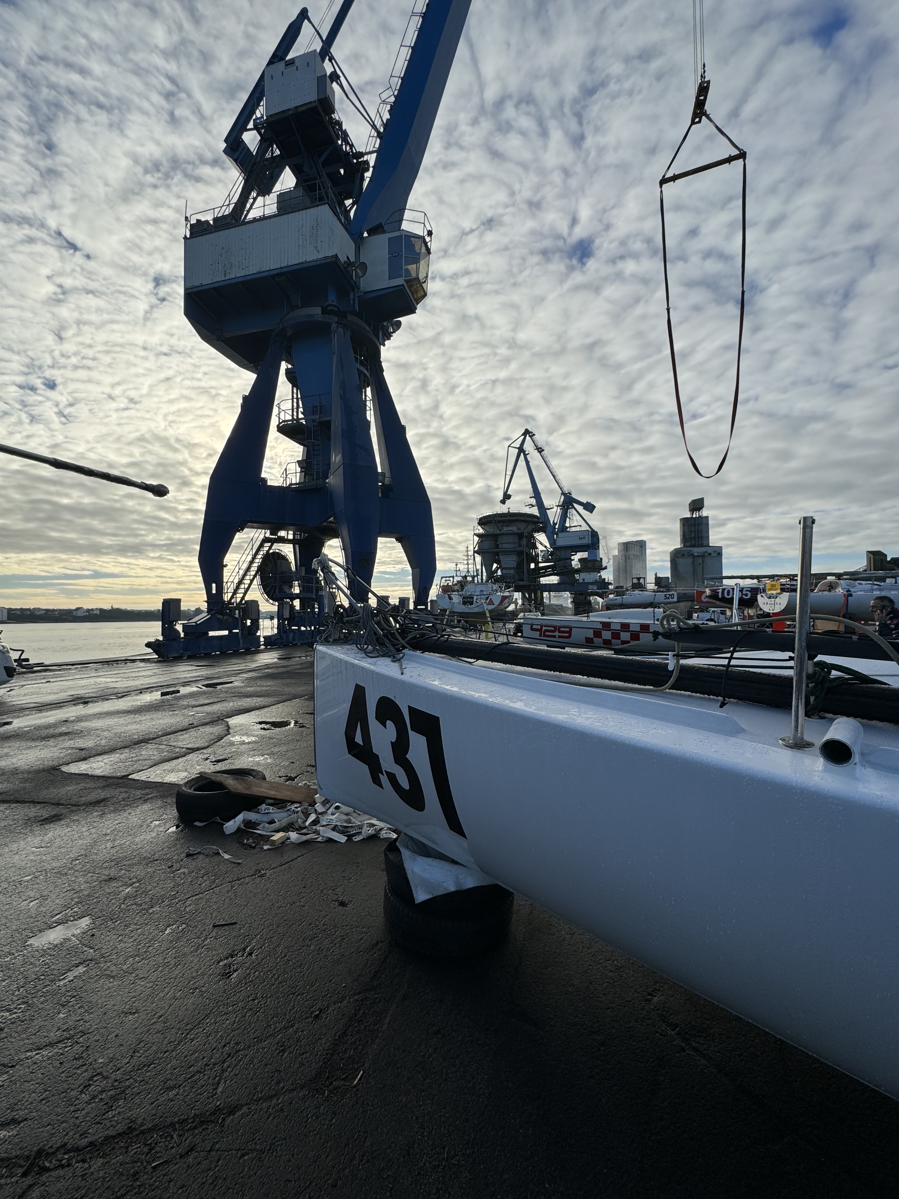 Il fait froid à Lorient , comme rarement. Nous tournons sur les docks sans trop savoir où aller et nous dirigeons grâce aux mats des voiliers déjà sur les quais. C’est plutôt rigolo de viser les mâts des 6,50. Au détour d’une allée , nous tombons sur des dizaines de mini 6,50 posés les uns contres les autres. Mais pas de 431. Tip Top Too n’est pas là. Quelques coups de fils plus tard, nous arrivons sur les quais de déchargement. Trop tard! les dockers partent en pause déjeuner et nous conseillent de faire pareil. Vous me direz, par 1° plein vent, j’accueille plutôt pas trop mal la nouvelle ! Il nous faudra donc attendre 14h pour espérer avoir la grue disponible.